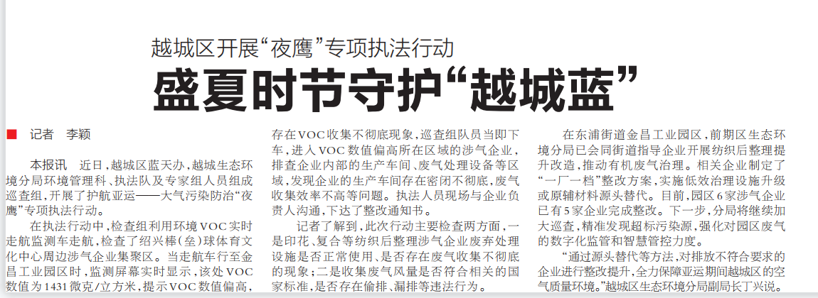 在执法行动中,检查组利用环境 VOCs 实时走航监测车走航,检查了绍兴棒(垒)球体育文化中心周边涉气企业集聚区。当走航车行至金昌工业园区时,监测屏幕实时显示,该处 VOC数值为 1431微克/立方米,提示VOC数值偏高,存在VOC收集不彻底现象,巡查组队员当即下车,进入 VOC 数值偏高所在区域的涉气企业,排查企业内部的生产车间、废气处理设备等区域,发现企业的生产车间存在密闭不彻底,废气收集效率不高等问题。