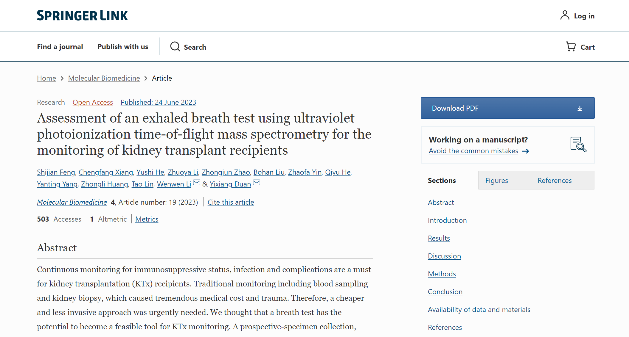 由成都市器官移植中心、华西第四医院、四川大学华西医院泌尿外科、四川大学化学学院、四川大学华西公共卫生学院、四川大学机械工程学院联合完成的文章“Assessment of an exhaled breath test using ultraviolet photoionization time-of-flight mas spectrometry for the monitoring of kidney transplant recipiesnts”于2023年6月在Springer Link公开发表。成都艾立本科技董事长段忆翔、总经理杨燕婷、质谱部部长赵忠俊参与完成。