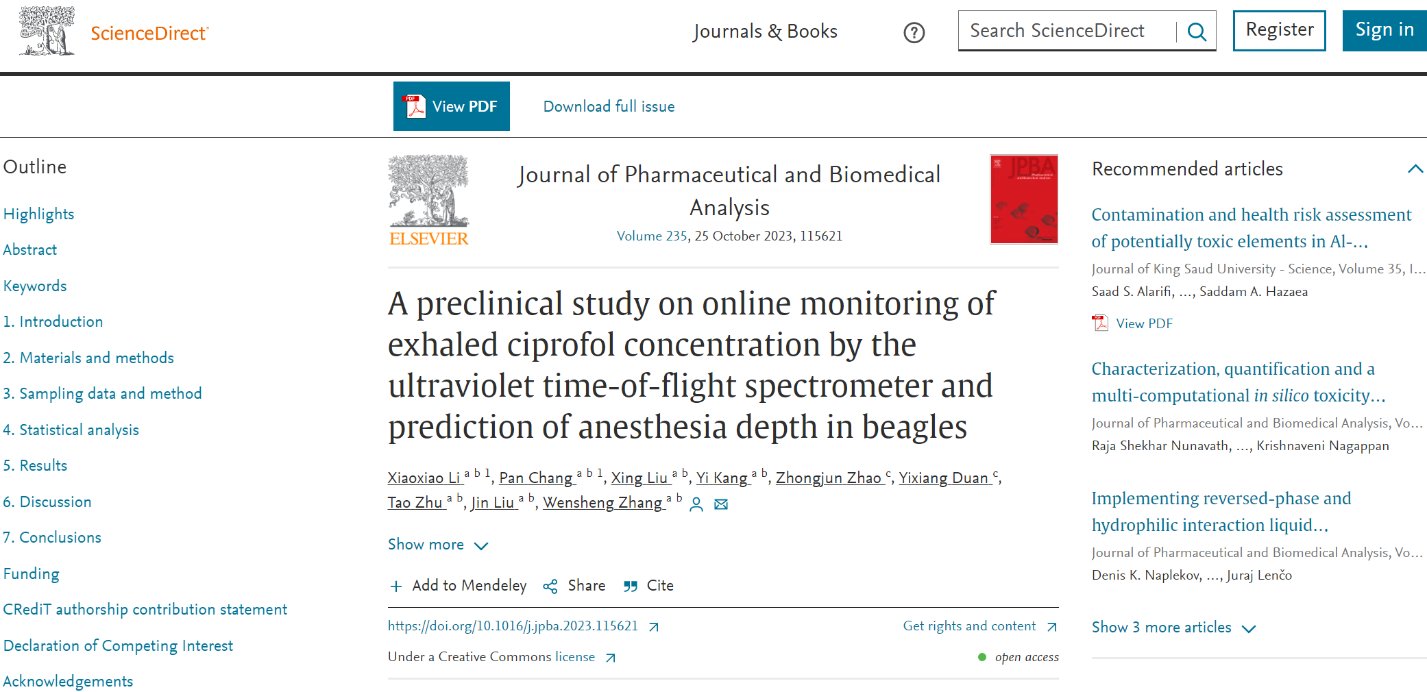 由四川大学华西医院麻醉科、四川大学华西医院麻醉转化医学国家地方联合工程研究中心麻醉与重症监护医学实验室、四川大学机械工程学院共同完成的题为“A preclinical study on online monitoring of exhaled ciprofol concentration by the ultraviolet time-of-flight spectrometer and prediction of anesthesia depth in beagles”的研究性论文在JPBA发表。本次研究设备由成都艾立本科技提供,实验及文章由艾立本科技董事长段忆翔和质谱部部长赵忠俊共同参与完成。