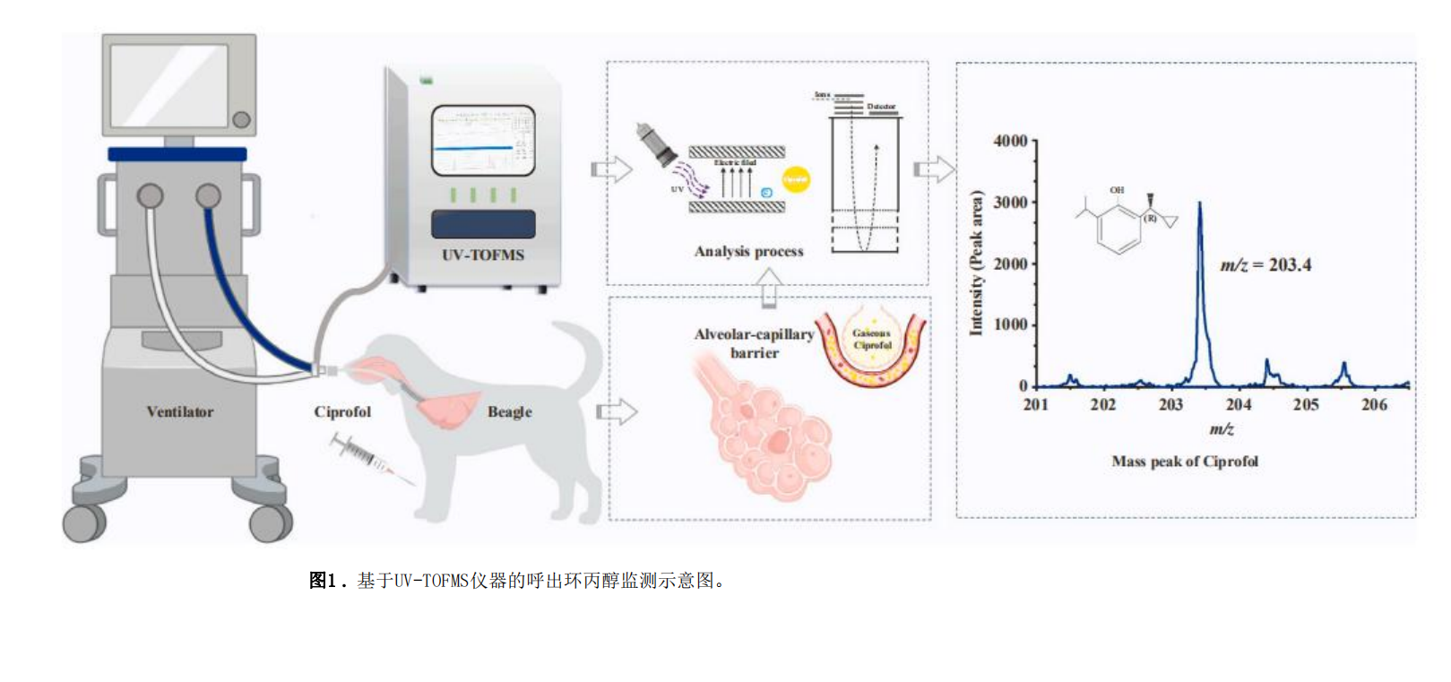 在本实验中,通过向比格犬注射环丙酚,基于UV-TOF MS仪器和血浆浓度(CP)以及CE和双谱指数(BIS)的药效学(PD)模型,建立呼出气中的环丙酚浓度的药代动力学(PK)模型,探讨CE与CP、CE和BIS的相关性,以此探讨监测呼出气中环丙酚浓度来滴定麻醉深度的可行性,为未来的临床试验提供动物实验数据。